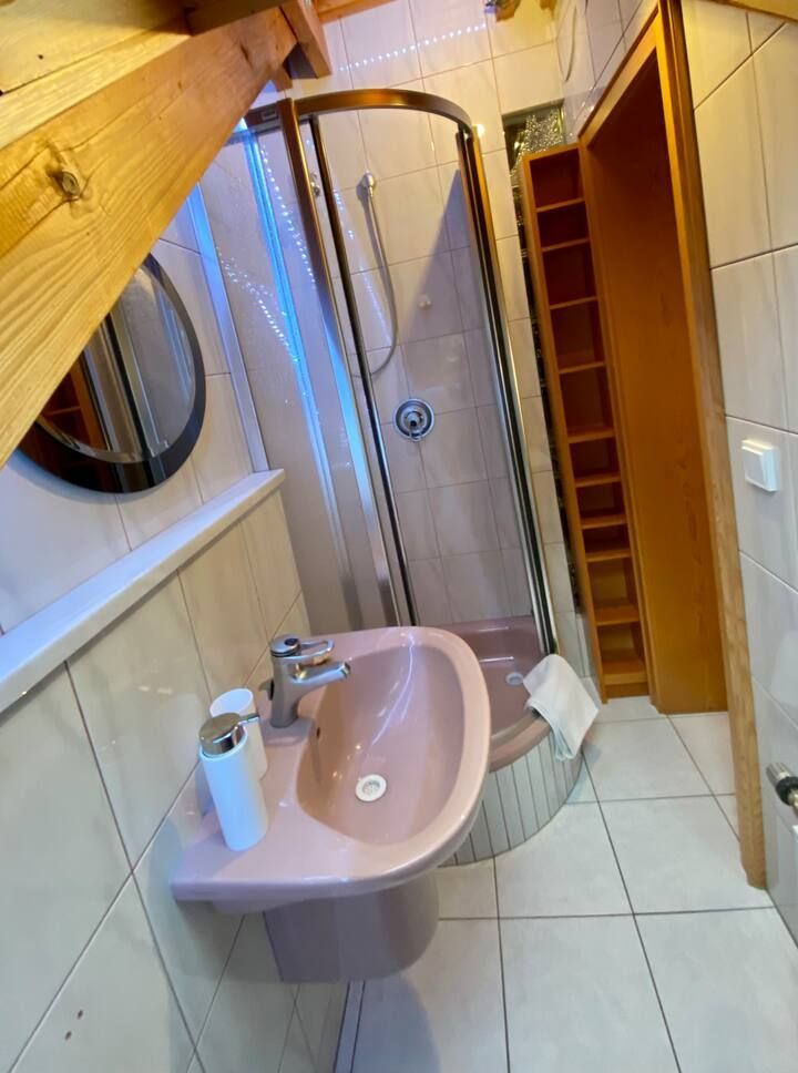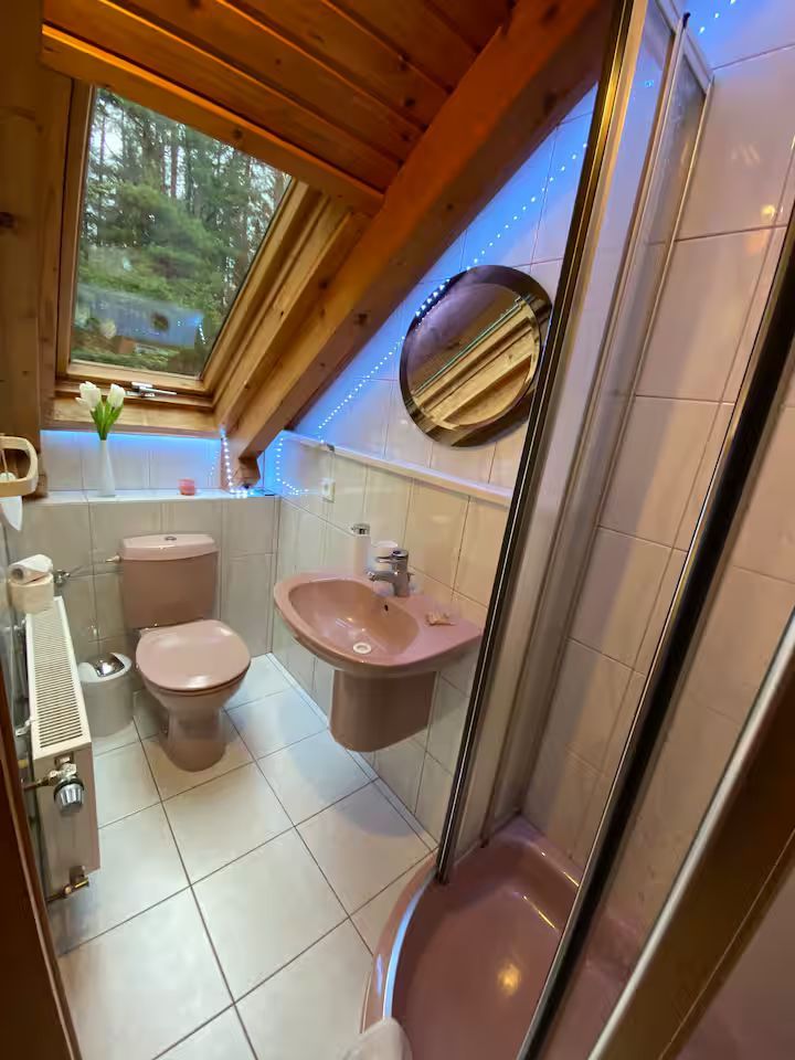 - Badezimmer mit Dusche, WC, Haartrockner, dimmbarer LED-Beleuchtung