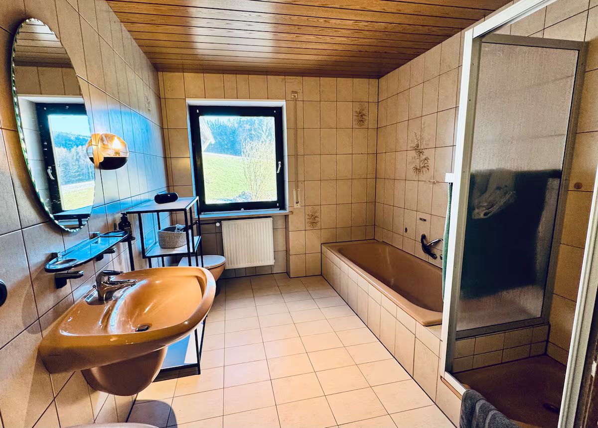 - Badezimmer mit Dusche, Badewanne, 2 Waschbecken, WC, Haartrockner, dimmbarer LED-Beleuchtung