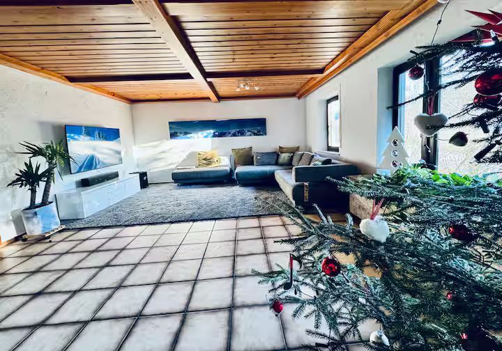 - Wohnbereich mit hochwertiger SCHILLIG-Couch und knisternden Kachelofen sowie einem 65Zoll - Smart TV mit Soundsystem
